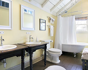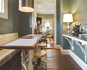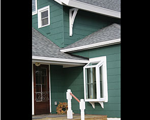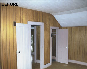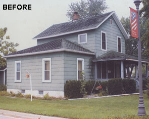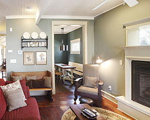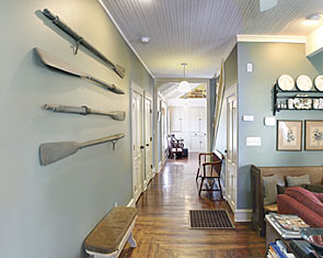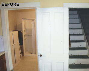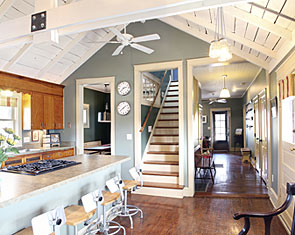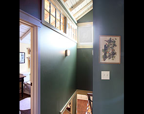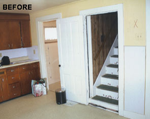 Restoration of old vintage farm house. Mission was to keep the original scale while opening up floor plan for more contemporary use, highlight kitchen as focal point with old wood rafters and super-energy efficienct SIPs panels, re-cycle owner's collage of parts, trim house with new, vintage-looking trim, keep old flooring, and showcase open views of rooms from staircase and transoms. By installing 12" deep insulated panels above the existing kitchen roof structure, we were able to expose the existing roof deck and joists on the interior to retain a vintage, rural look -- back the way it used to be. Although all improvements added up-to-date amenities, the original, rural look was maintained. Despite exceeding minimum energy code requirements, there is no change in the physical appearance |