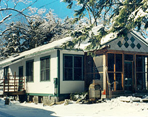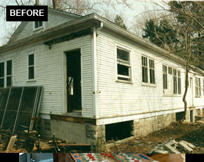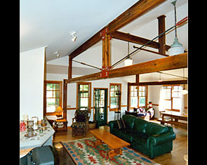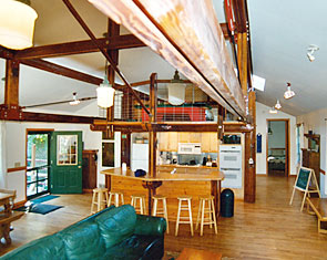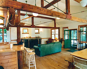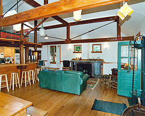Renovated and de-converted 80 year old, dilapidated, duplex cottage to 1.5 story, open floor plan, single family cottage using giant open trusses re-cycled from Sears warehouse flooring and other re-claimed building parts such as 9' pocket doors used for bedroom doors, stained glass windows, and beach rocks on fireplace. Loft bedroom is boat shape extending over kitchen below. |