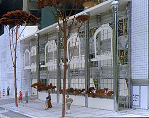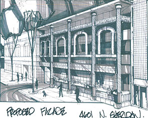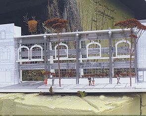 Provide screen for existing parking garage. Classical elements of columns and arches were designed to replicate the scale of historic building next door.